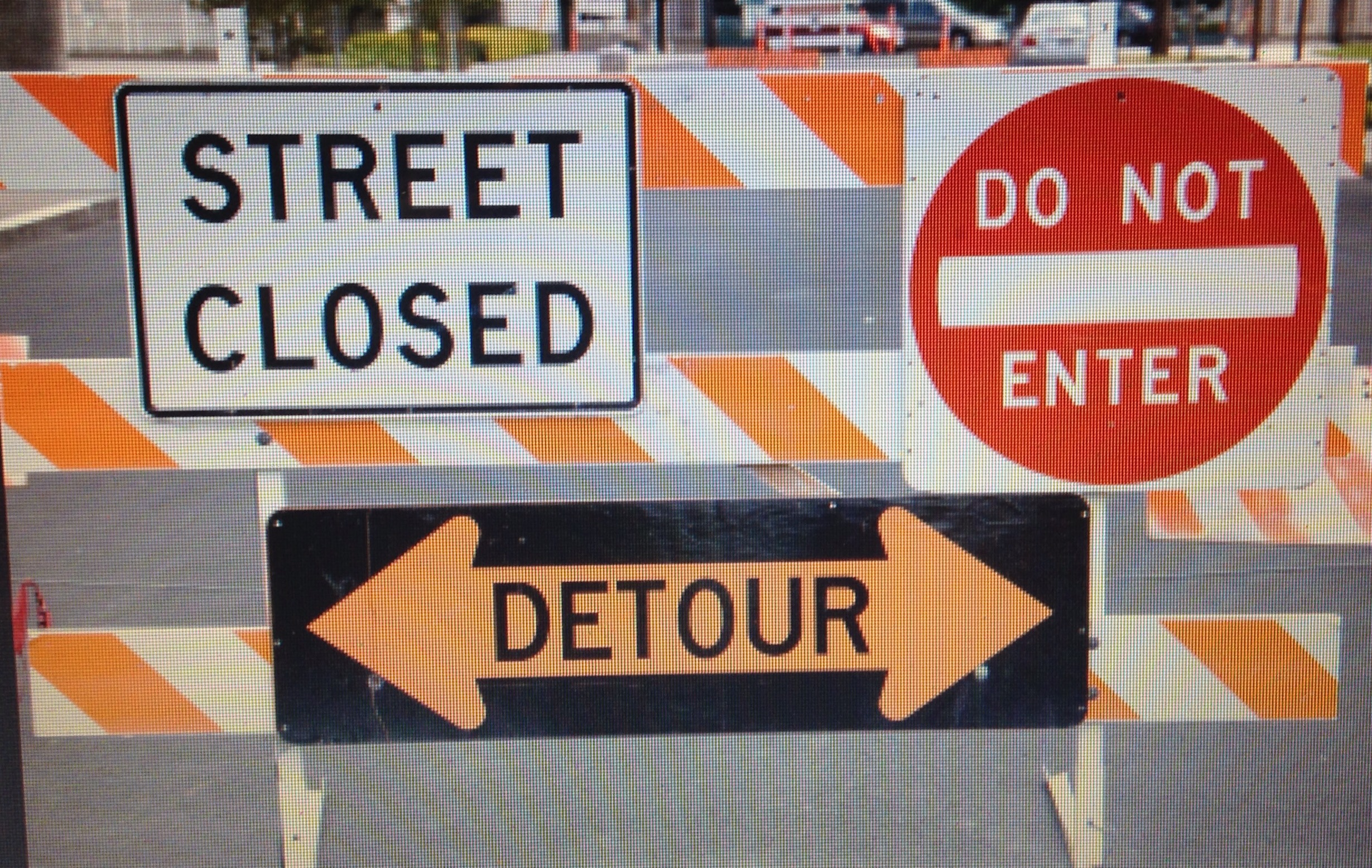 And a man in a safety vest standing in the middle of the street waving his arms and pointing to the left. Another detour.