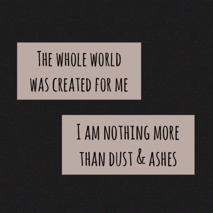 We can stand here, in the middle of two pockets, resting in the center, always remembering that both exist. In all situations there is a bit of both. The whole of the universe is mine-all-mine, and I am nothing more than dust and ash.