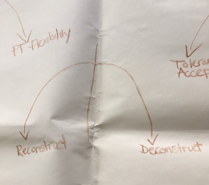 I’ve spent some time reflecting, as one does, when the calendar reminds us to. I was looking through some paperwork from last year, and found a folder from February when I went digging for dharma on a yoga retreat with friends. While I was there we did some written exercises. We created tension arcs on a large sheet of paper. As I unfolded the paper I saw words I had written on my tension arcs. Part Time Flexibility vs Full Time Pay, Teaching vs Writing, etc. In the center of the page in large letters is Reconstruct vs Deconstruct.