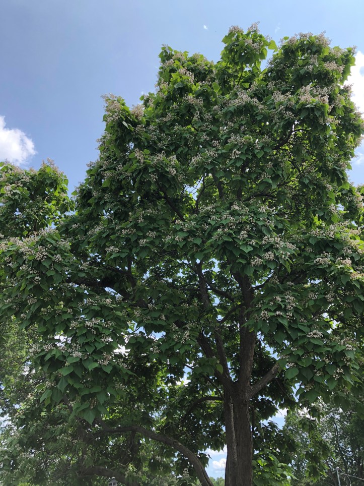 This catalpa tree changes with the seasons. It is the last to let go of its giant leaves in the fall, and the very last to leaf out in the spring. Its leaves are heart shaped and as big as both of my hands. It flowers in mid June and it sheds its sweet scented popcorn-looking petals right around the solstice. Its long green bean-like things will grow through the summer, then turn brown, dry up, and try to hang on through the winter.