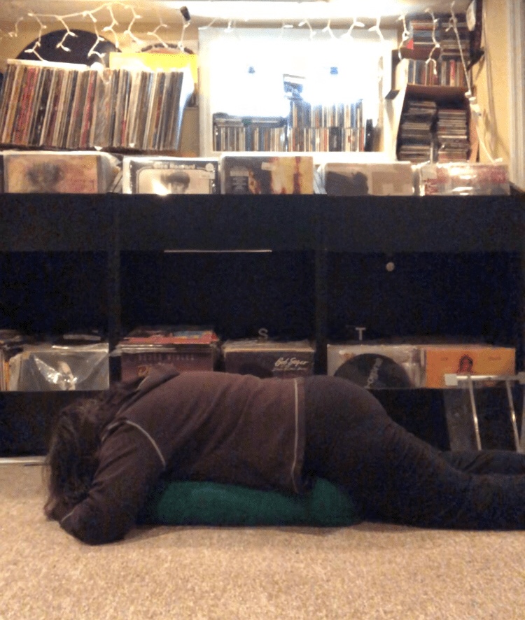 Put a cushion on the floor, or pile 2 or 3 pillows on top of each other on the bed and lie down on them. Let all of your weight release into the pillows. Let yourself be as heavy as you can. Take slow deep breaths. Stay in this position for a few minutes, then slowly make your way out of it. Notice if you feel any relief. I hope you do.
