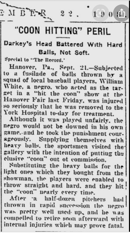 It was a game where a black man or boy would put his head through a hole in a sheet and the white men would pay to throw baseballs at his head. Baseballs. Hurry! Hurry! Step right up! 3 balls for a nickel! The ‘dodger’ was paid for his time, and he often made more money than he would at manual labor. But some of the dodgers ended up in the hospital with brain damage, and some of them ended up dead.
