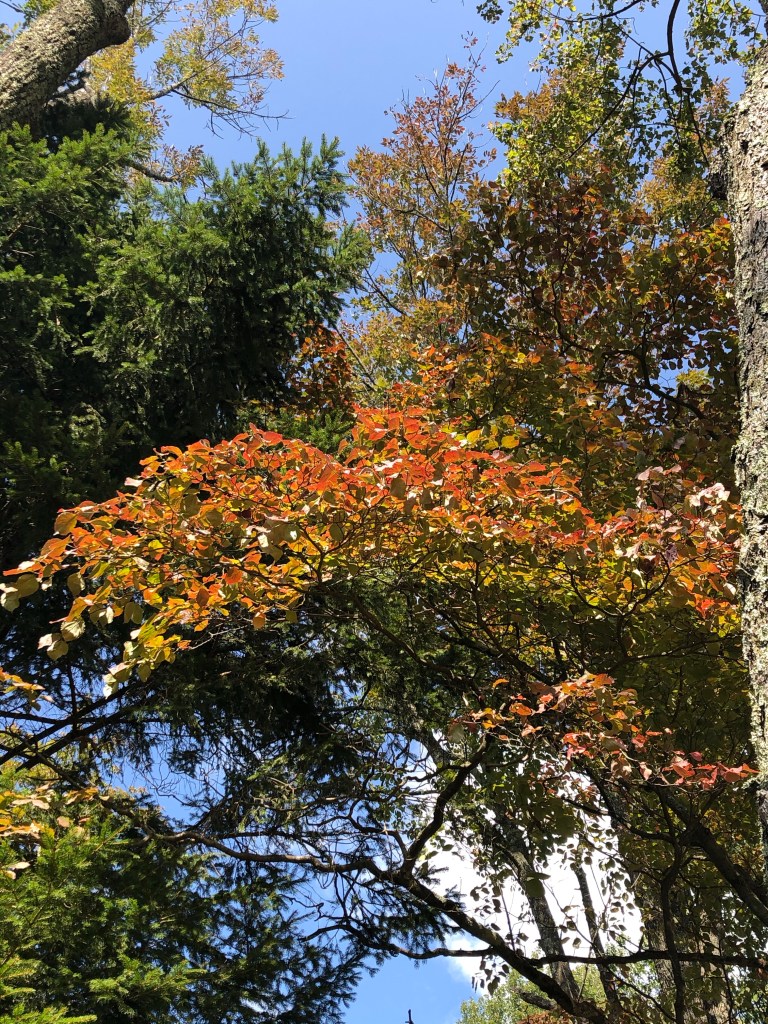 Pretty. We were noticing the leaf change today. It was 84, which is very warm for this time of year. But it was in the 40s this week, too, so leaves are dropping even as goldenrod is still clinging to some blooms.