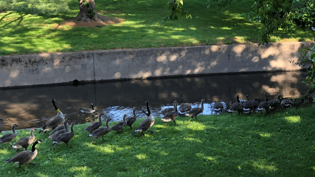 It was only seven or eight weeks ago that we were watching the mother geese sitting on their nests, while their ganders waded in the wings. It was only five or six weeks ago that we were watching tiny hatchlings skating on top of the river to catch up to their siblings. It was only three or four weeks ago that we were watching the growing goslings move in and out of the river, and venture a little farther from their families.