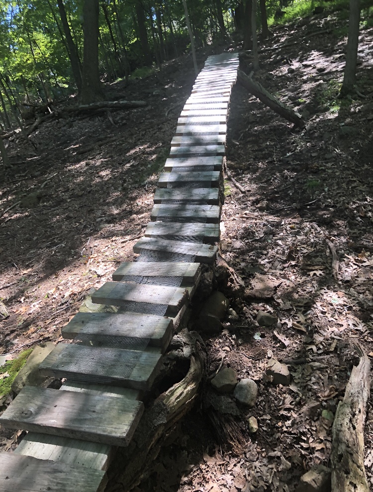 We came across an unmarked path and we saw a few small wooden bridges and ramps that someone had made, presumably for bmx or mountain bikes. I stepped up onto one of them to take a good look. It was made of 2 inch slats of wood placed an inch apart. It was ~12 inches wide. It was nailed into a curvy felled tree trunk. It rose up and came back down, and like a roller coaster track with curves, it tilted to one side, then the other. At the highest point in the center it was ~4 feet off the ground and propped up by a few thick branches.