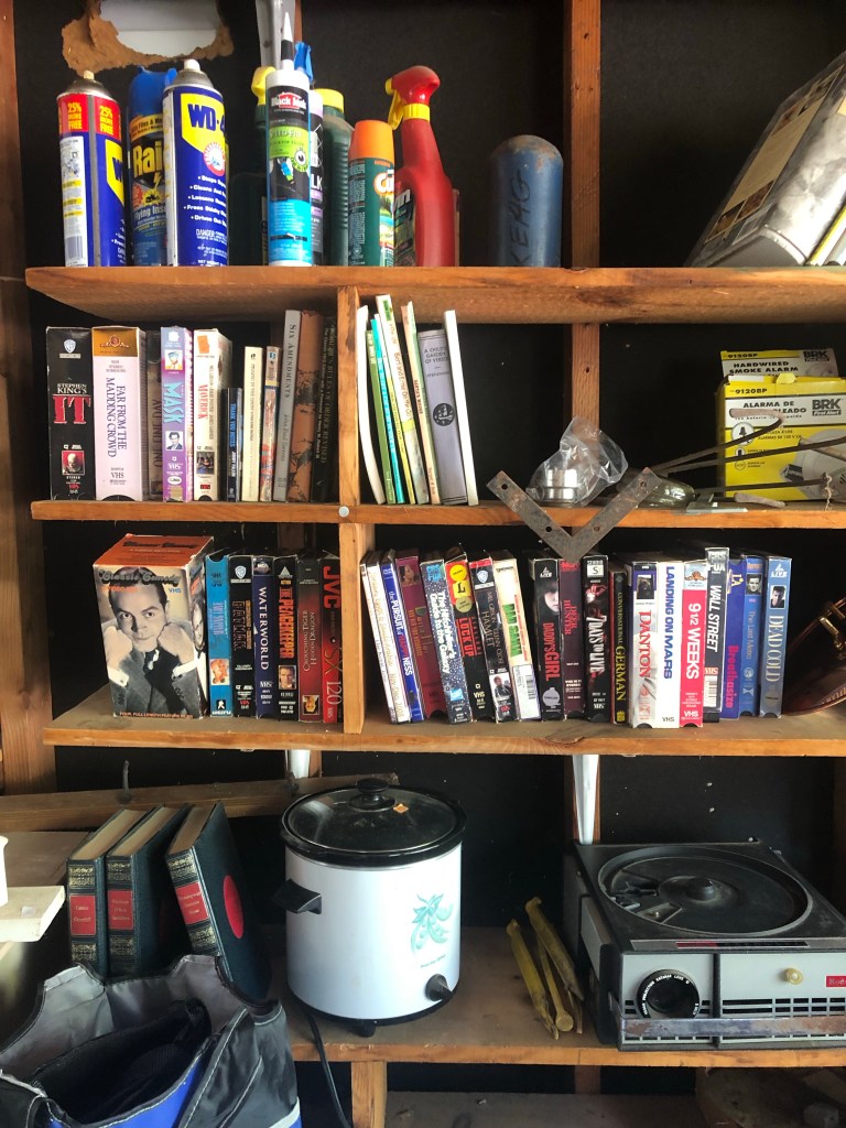 I stand in the garage, filled with homemade doll houses, tools, art supplies and shelves full of miscellaneous things. VHS movies, books, WD-40. A crock pot. A Kodak slide carousel. Things collected over a lifetime.