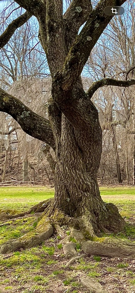 And now I am sitting here, on the exposed roots, looking up through the dark hypnotic maze of branches. They have no buds. They have a few buds. They are coated in ice. They are in full bloom. I can see all versions of the tree simultaneously.